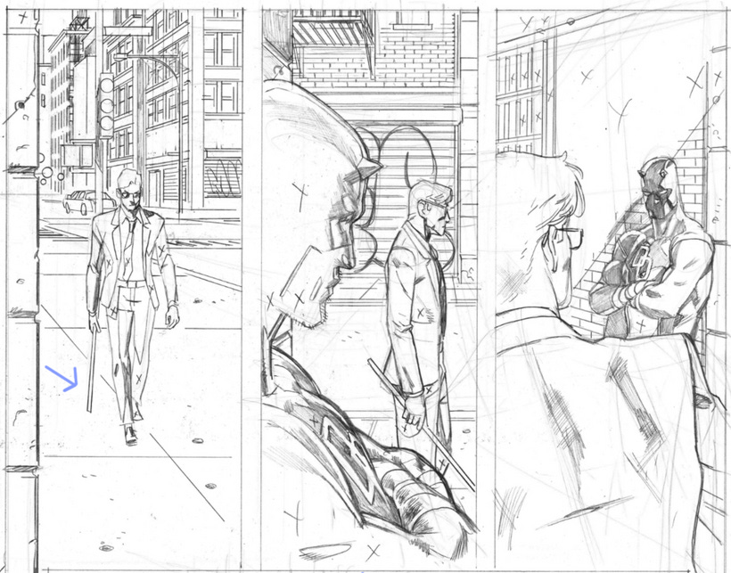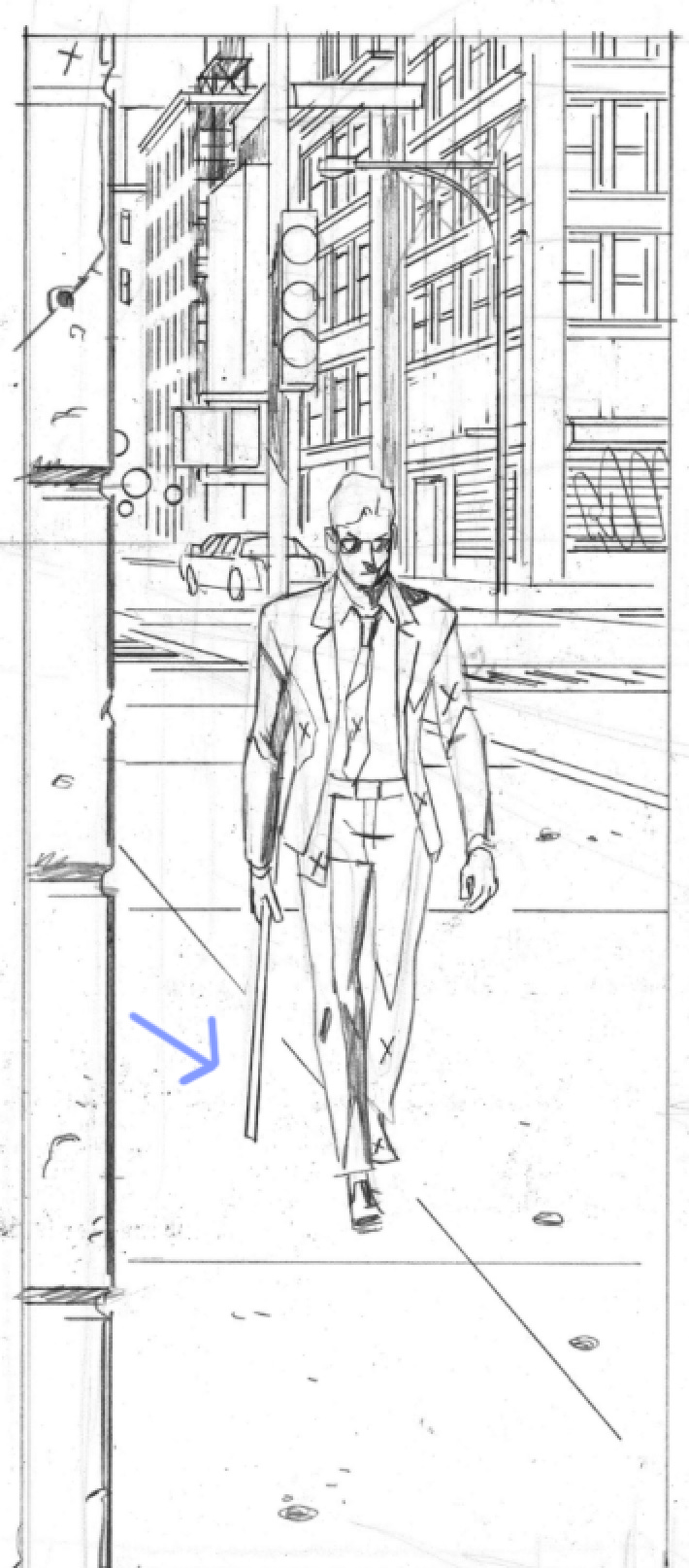 I use some visual clues to let the reader know this. Note how he’s not really using his cane in panel one, but casually carrying it. He’s pretending to be blind, after all. Also, DD was able to sneak up on him so he clearly doesn’t have his super hearing.