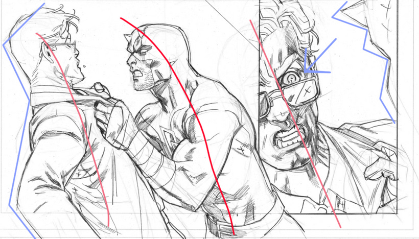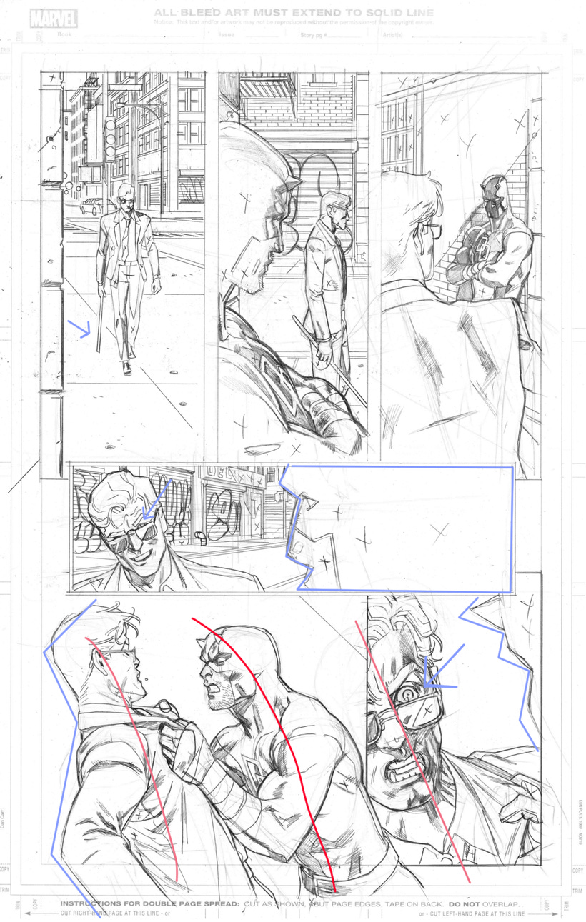 In the last panel Fake-Matt is again showing that one eye, both as a way to show he’s not really blind and thus not Matt, but also as a way for me to create tension (and a tiny-cliffhanger) here before we leave the page. He’s less scared here, and is pushing back a bit against DD, though still leaning away. To get the point across that he’s confronting DD I needed the right feeling and expression. I don’t want to make it mellow dramatic. He’s not angry in a “comic book” sense, he’s something else.