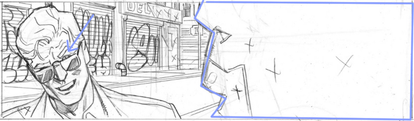 I use body language to get their feelings across. Fake-Matt leaning away from DD, a bit scared, but playing it off with a fake smile and a hint at his mischievous eye. I keep one eye covered though, as he’s a liar and I want you to get a sense of him hiding something. For his part DD is all sharp edges, a kind of saw blade shape dominating most of the panel and leaning in towards Fake-Matt. DD takes up half the panel, leaving little room for Fake-Matt to escape.
